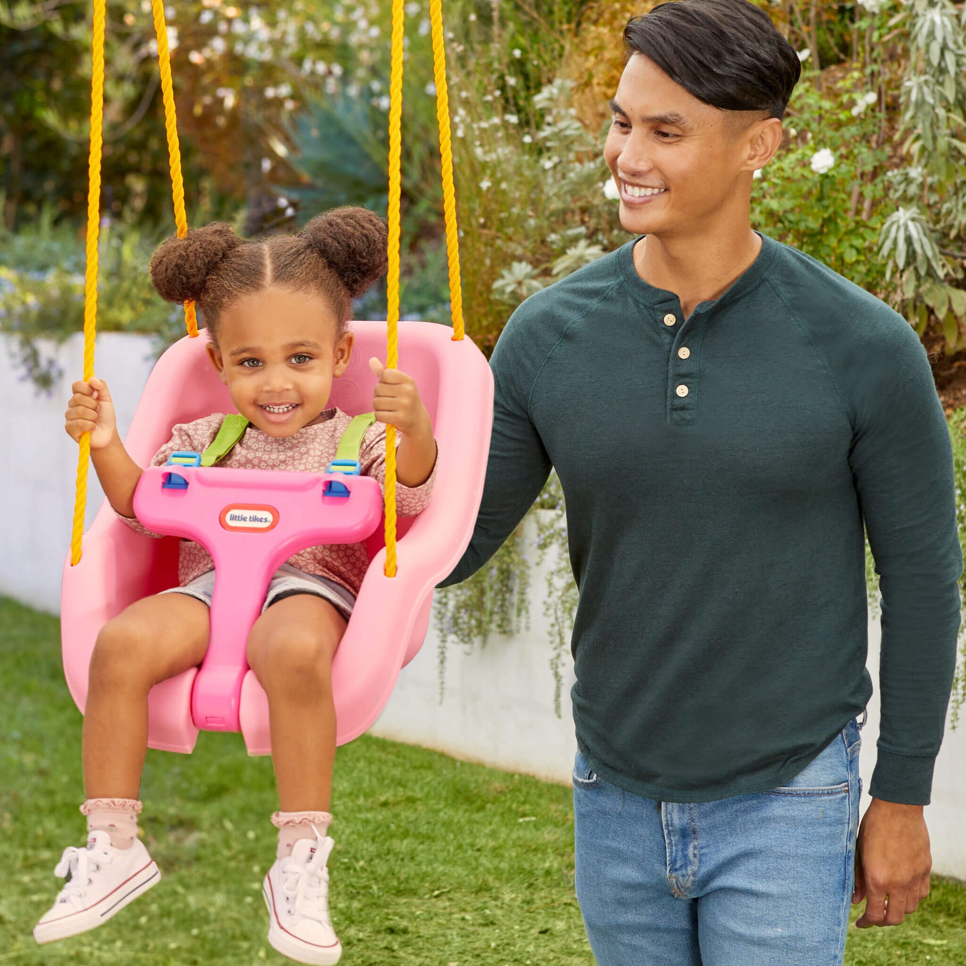 The Little Tikes 2-in-1 Snug 'n Secure™ Swing in Pink is the perfect swing for babies and toddlers who love outdoor play. This versatile swing grows with your child, transitioning seamlessly from a baby swing to a toddler swing.