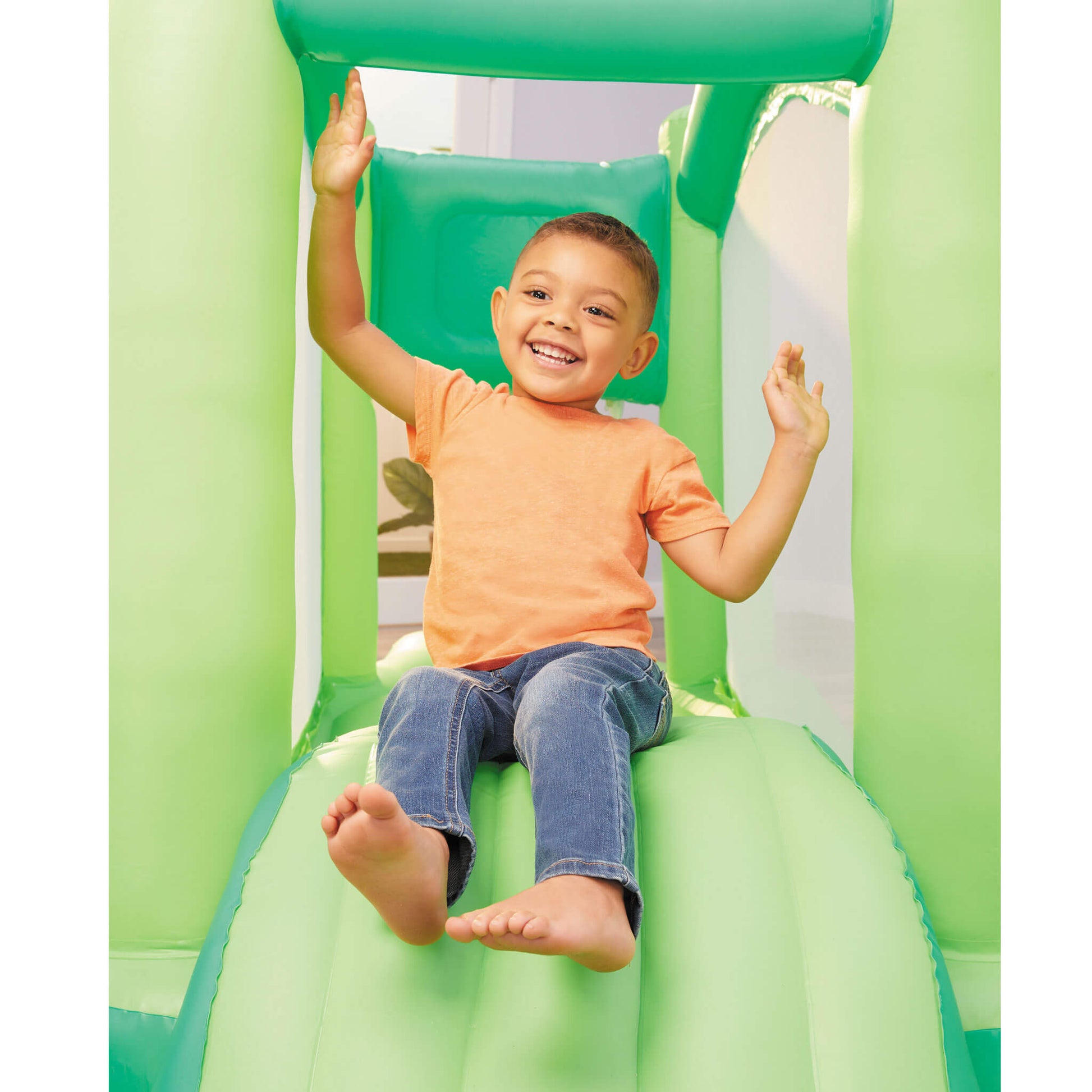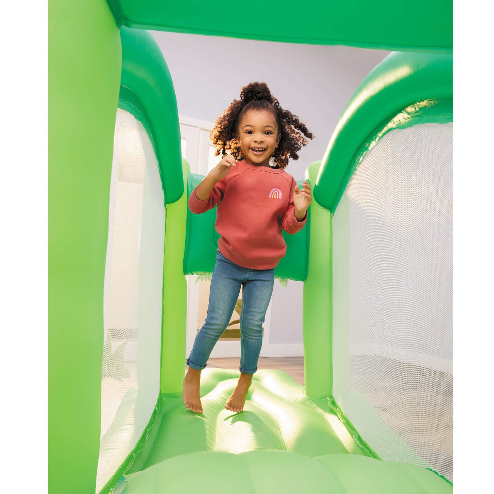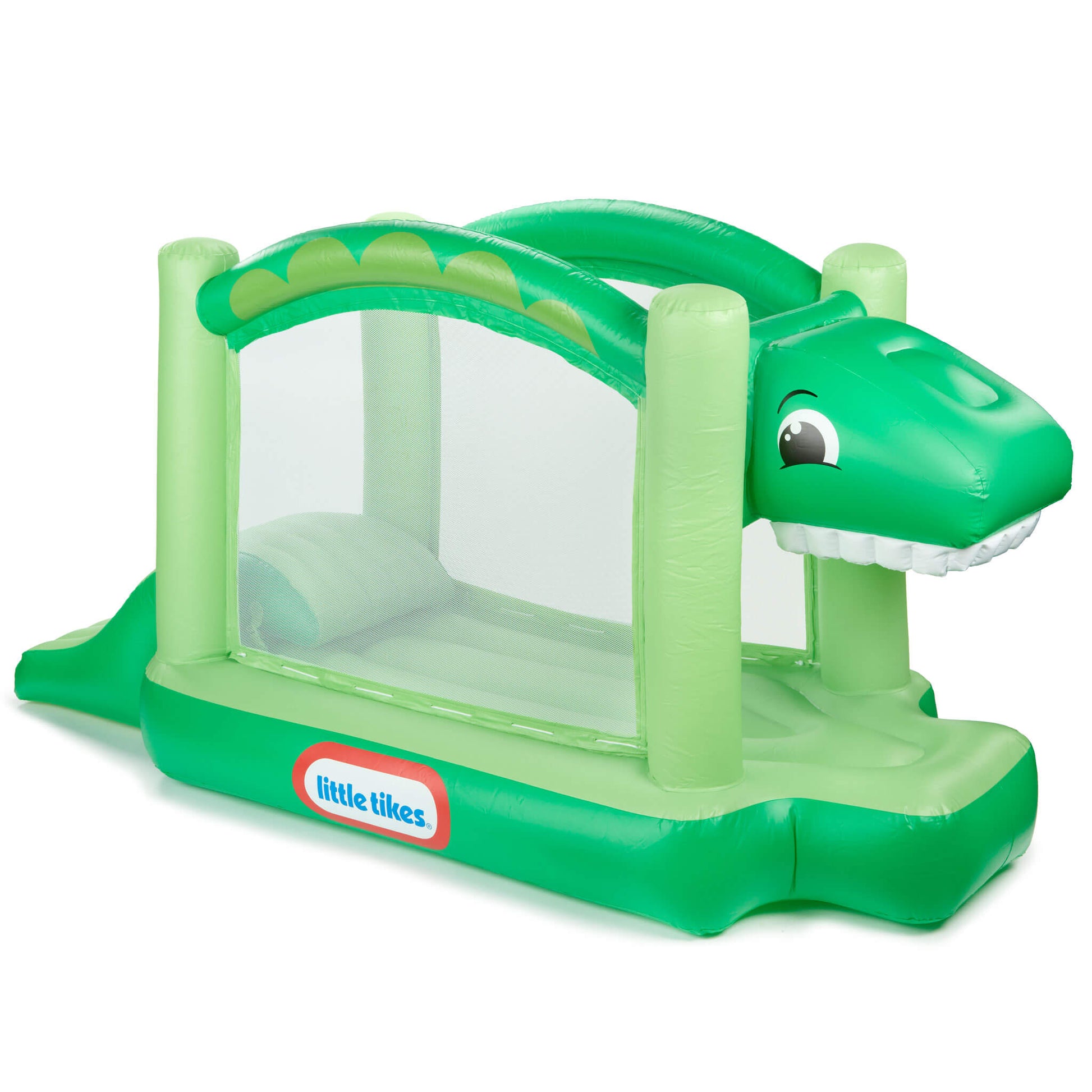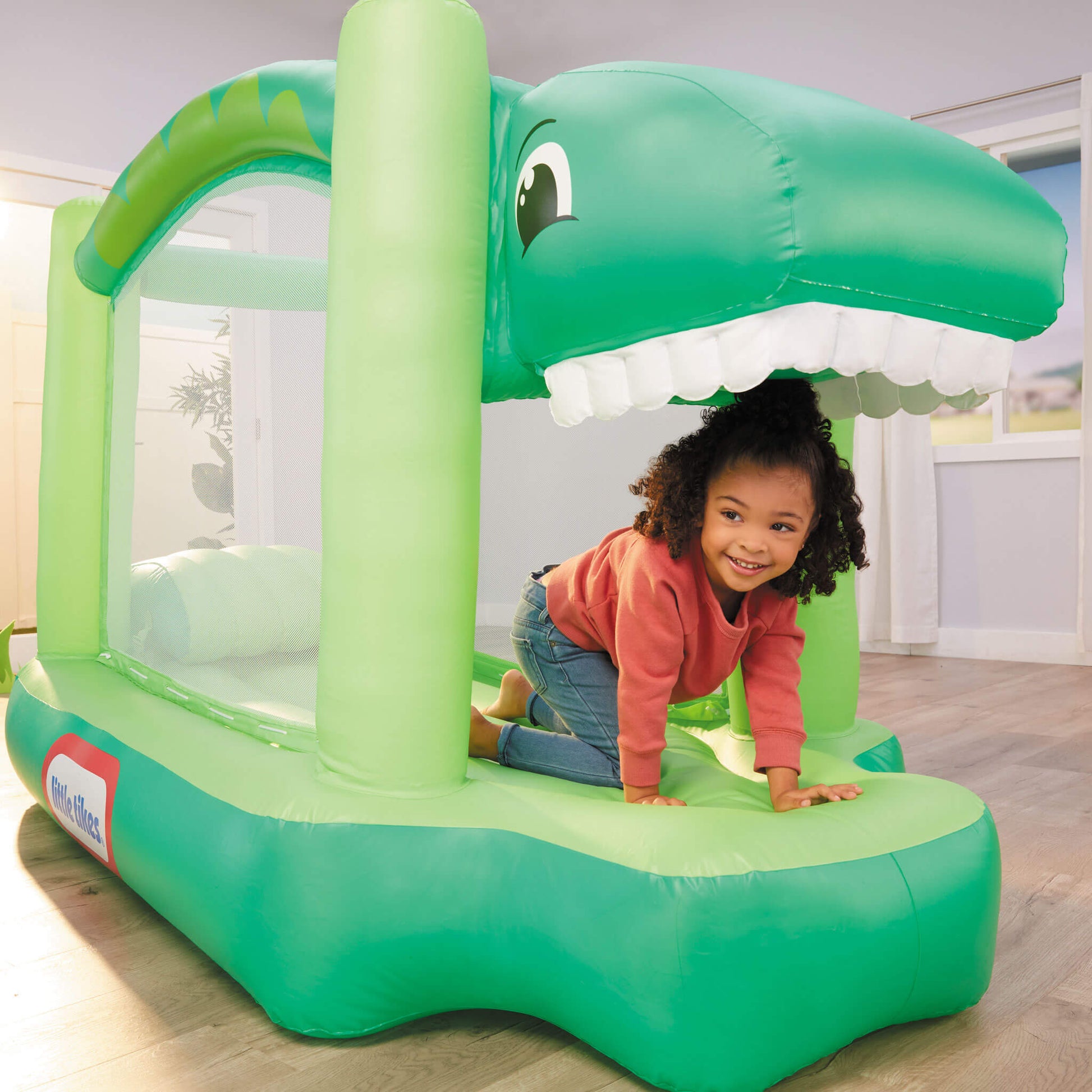 The Little Tikes Dino Bouncer is the ultimate indoor inflatable playset for kids, featuring a friendly dinosaur design, beginner slide, and openings at each end for endless fun. With a built-in blower, the bouncer inflates in seconds with the flip of a switch, and the reverse blower setting ensures quick and hassle-free deflation and storage.