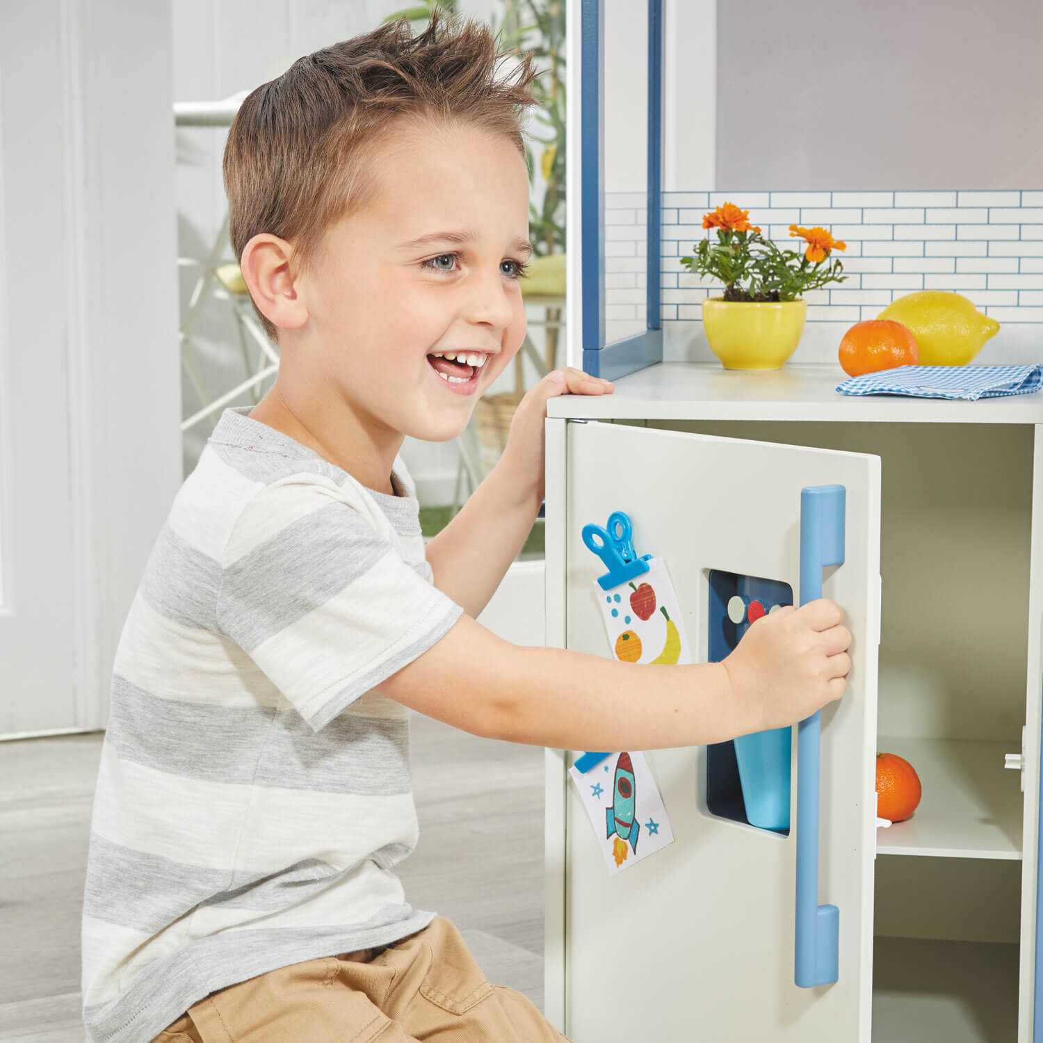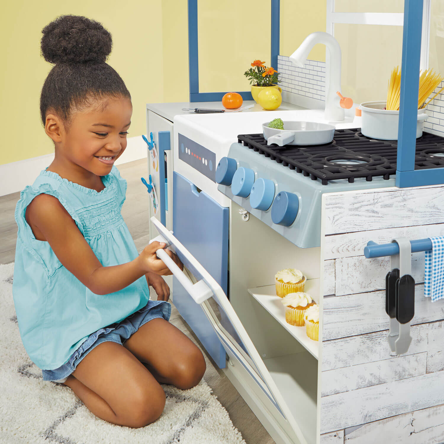 This designer inspired Little Tikes Wood Chef's Kitchen is equipped with everything kids will need to let their inner chef and social entertainer out. Realistic knobs, lights and sounds enhance play on this sturdy wood kitchen that will last and last.